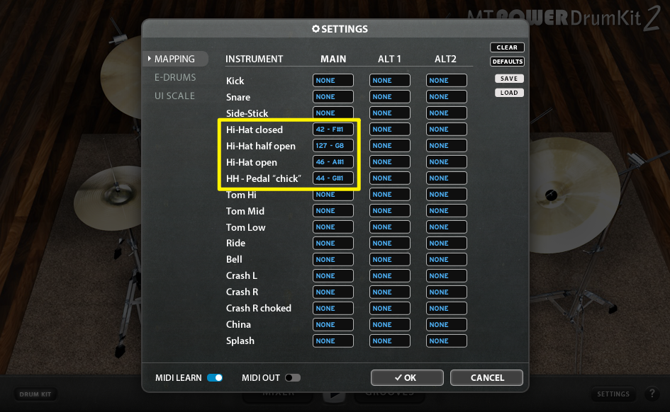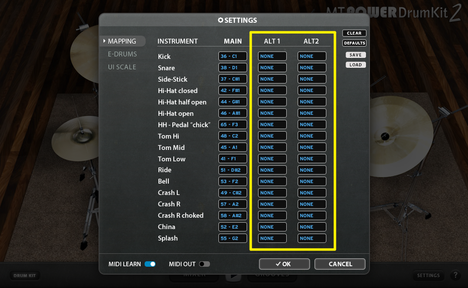 Mit aktivierter MIDI LEARN Funktion, kann man einfach ein Feld auswählen und dann das E-Drum Pad oder Becken anschlagen, das man dem Feld zuweisen möchte. Die vom Modul gesendete Note wird dann automatisch vom ausgewählten Feld übernommen.