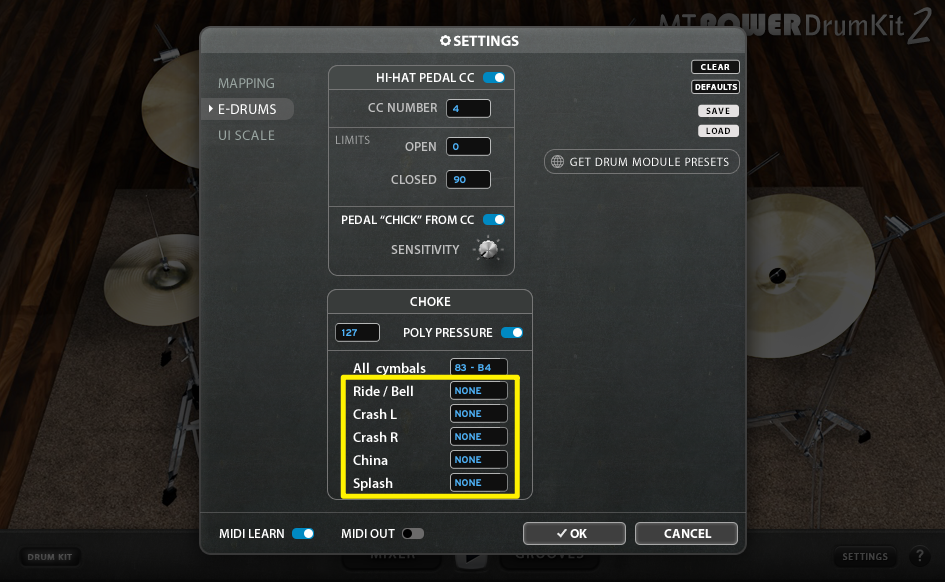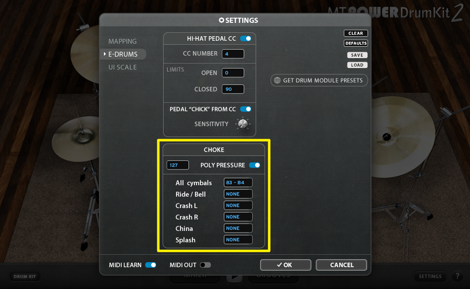 Wenn du Glück hast, dann sendet dein Drum-Modul sogenannte PolyPressure Daten fürs Choking. In diesem Fall musst du überhaupt nichts im CHOKE-Bereich ändern, und das Abdämpfen sollte sofort klappen. Wenn dein Drum-Modul jedoch stattdessen verschiedene normale MIDI-Noten für jedes Abdämpfen eines jeden Beckens sendet, dann musst du womöglich diese Felder einzeln anpassen. Die MIDI LEARN-Funktion wird hierfür wieder hilfreich sein.