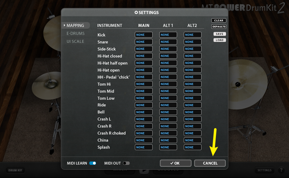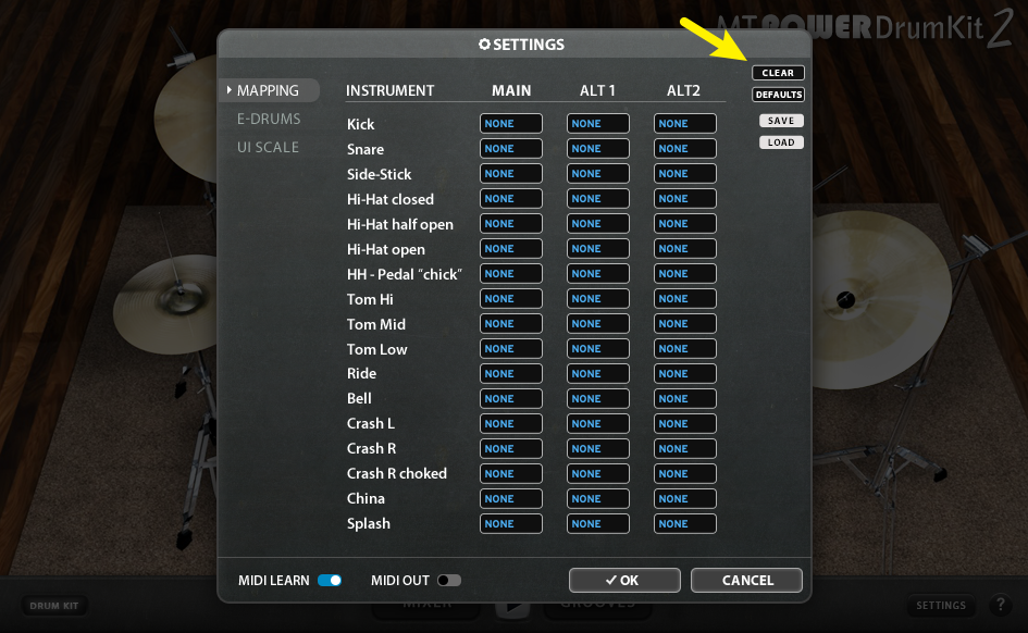 Wenn du komplett von vorne beginnen möchtest, kannst du alle Felder mit dem CLEAR-Button leeren lassen. (Du kannst dies mit ABBRECHEN wieder rückgängig machen, falls du die vorherige MIDI-Belegung zurückholen willst).